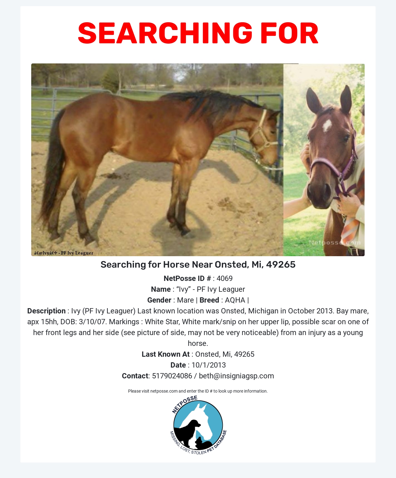 Searching For Horse Named Ivy Pf Ivy Leaguer Onsted Mi 49265 Netposse Id 4069